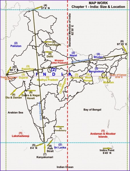 (iii) Tropic of Cancer passes through the states of Gujarat, Rajasthan, Madhya Pradesh, Chhattisgarh, Jharkhand, West Bengal, Tripura and Mizoram.