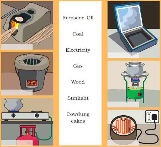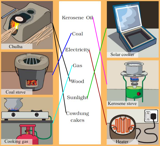 Identify the pictures given below and write their names. What produces heat in each of them? Match the picture with the list. Matching can be with more than one thing also.