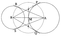 4. With center M and radius AM = BM, draw a circle intersecting the two circles at P, Q, and R, S.