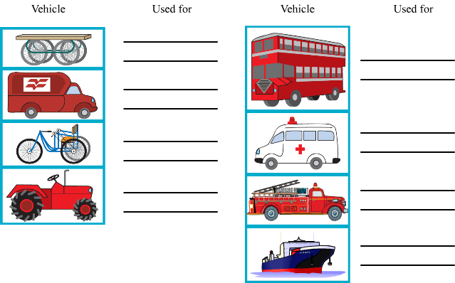 Write in front of each picture what the vehicle is used for. In the spaces provided, draw the pictures of some other vehicles. Write their names and what they are used for. Are all these vehicles used for our travel?