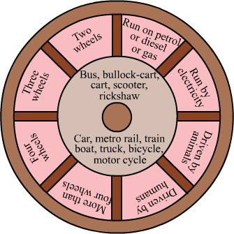 Names of some vehicles are given in the centre of a wheel. Join these on one side to the number of wheels each vehicle has and on the other, join them to what is used to run them.