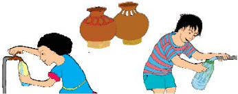 Filling Pots Naseem and Abdul had to fill their pots each with water. Both pots were equally big and heavy. So they went to the tap again and again, filled their own bottles and poured water into the pots.