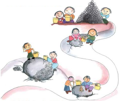 • Mark A, B, C on the right hole in the picture. • Which is the biggest pothole? _____________ • If jugs are used, hole A gets filled with 5 jugs. How many jugs of pebbles are needed to fill hole B? ____________