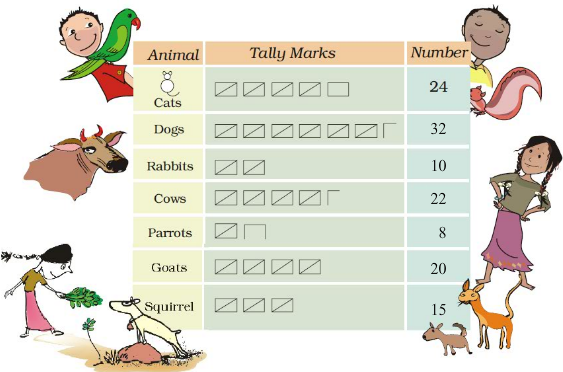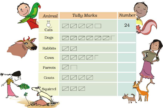 • Look at the tally marks and write the number for each animal in the table. How many children in all did Yamini talk to? • Which is the most favourite pet animal in this table? • Which pet will you like to have? What will you name it? Which other animals can be kept at home? Discuss.