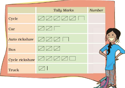 Sumita stood on the road for half an hour and counted the number of vehicles passing by. She made a tally mark for each vehicle. This helped her in counting quickly the total number of vehicles in each group.