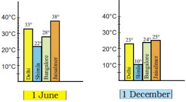 • Temperature difference on 1 June and 1 December for Delhi = ​33 ∘C − ​23 ∘C = ​10 ∘C Temperature difference on 1 June and 1 December for Shimla = 22 ∘C − ​10 ∘C = 12∘C Temperature difference on 1 June and 1 December for Bangalore = 28∘C − ​24 ∘C = 4∘C Temperature difference on 1 June and 1 December for Jaisalmer = 38∘C − ​25 ∘C = 13∘C Thus, Bangalore shows little change in temperature on 1 June and 1 December.