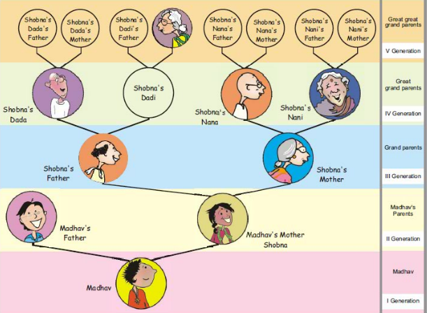 Madhav went to a wedding along with his parents. He met many relatives there. But he didn’t know everyone. He met his mother’s grandfather, but found that her grandmother is not alive. He also found that her Dadi‘s mother (grandmother’s mother) is still alive, and is more than a hundred years old. Madhav got confused. He couldn’t imagine his mother’s grandmother’s mother! So, Madhav’s mother made a family tree for him —