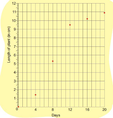 Amit sowed a few seeds of moong dal in the ground. The height of the plant grew to 1.4 cm in the first four days. After that it started growing faster. Amit measured the height of the plant after every four days and put a dot on the chart. For example if you look at the dot marked on the fourth day, you can see on the left side scale that it is 1.4 cm high. Now look at the height of each dot in cm and check from the table if he has marked the dots correctly.