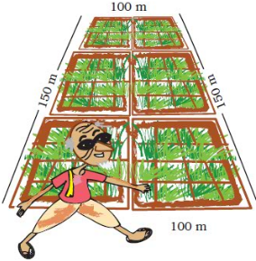 Length of the boundary of Chandu’s field = 100 m + 150 m + 100 m + 150 m = 500 m ∴ Distance covered by Chandu’s father in one round = 500 m Chandu’s father takes four rounds of the field every morning. Distance covered by Chandu’s father in four rounds = 4 × 500 m = 2000 m Now, 1 km = 1 × 1000 m ∴ 2 km = 2 × 1000 m
