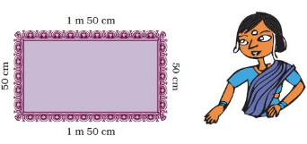 Length of the table cloth = 1 m 50 cm = 1 × 100 cm + 50 cm = 100 cm + 50 cm = 150 cm Width of the table cloth = 50 cm Length of the boundary of the cloth = 150 + 50 + 150 + 50 = 400 cm = 4 m Working: 150150050+050400Thus, the length of lace needed for one table cloth is 4 m.