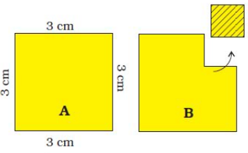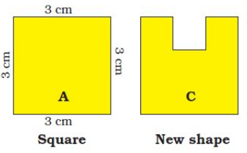 (a) Length of each side of square A = 3 cm Number of sides of square A = 4 Length of the boundary of square A = 4 × 3 cm = 12 cm Now, a small square of side 1 cm is cut off from one corner of square A. ∴ Length of the boundary of B = 2 cm + 1 cm + 1 cm + 2 cm + 3 cm + 3 cm = 12 cm Thus, the length of the boundary of square B will remain the same as that of square A.