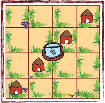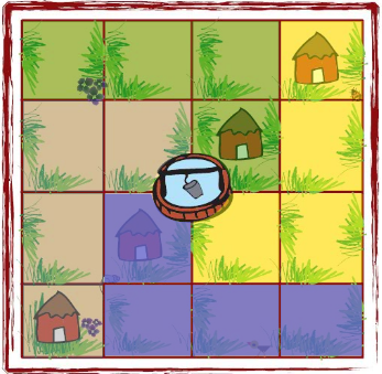 Puzzle: A House and the Well Raghavan has a piece of land. There are 4 houses on his land and in the middle there is a well. He wants to divide this land equally among his four children. Each should get one house and be able to use the well without entering the other’s land. Can you help him divide the land? Give different colours to each one’s share.