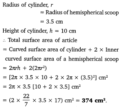 A wooden article was made by scooping out a hemisphere from each end of a solid cylinder, as shown in figure. If the height of the cylinder is 10 cm, and its base is of radius 3.5 cm, find the total surface area of the article.