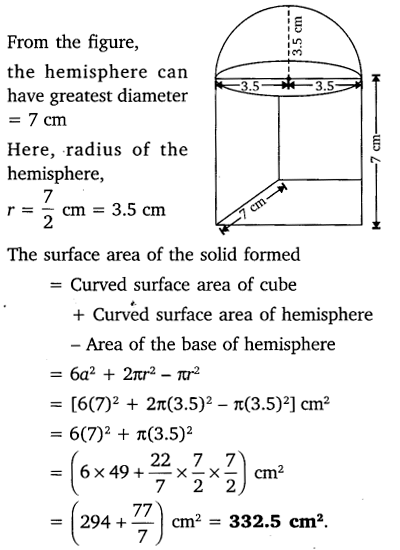 A cubical block of side 7 cm is surmounted by a hemisphere. What is the greatest diameter the hemisphere can have? Find the surface area of the solid.