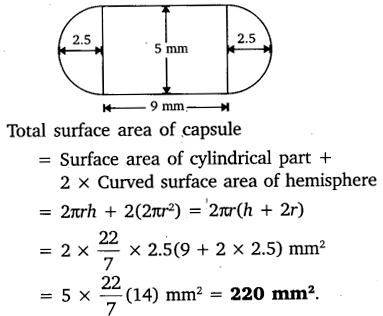 A medicine capsule is in the shape of a cylinder with two hemispheres stuck to each of its ends (see figure). The length of the entire capsule is 14 mm and the diameter of the capsule is 5 mm. Find its surface area.