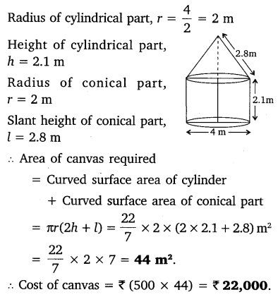 A tent is in the shape of a cylinder surmounted by a conical top. If the height and diameter of the cylindrical part are 2.1 m and 4 m respectively, and the slant height of the top is 2.8 m, find the area of the canvas used for making the tent. Also, find the cost of the canvas of the tent at the rate of ₹ 500 per m². (Note that the base of the tent will not be covered with canvas.)