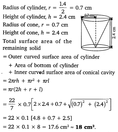 From a solid cylinder whose height is 2.4 cm and diameter 1.4 cm, a conical cavity of the same height and same diameter is hollowed out. Find the total surface area of the remaining solid to the nearest cm².