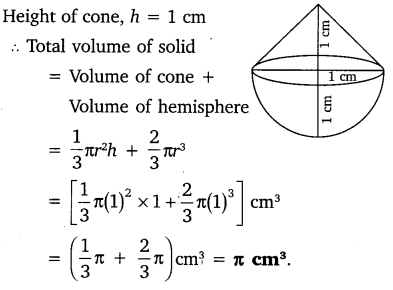 A solid is in the shape of a cone standing on a hemisphere with both their radii being equal to 1 cm and the height of the cone is equal to its radius. Find the volume of the solid in terms of π.