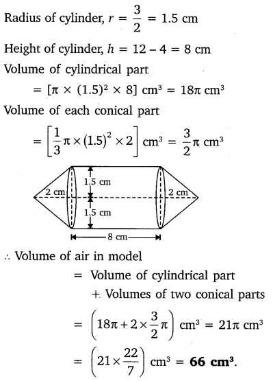 Rachel, an engineering student, was asked to make a model shaped like a cylinder with two cones attached at its two ends by using a thin aluminium sheet. The diameter of the model is 3 cm and its length is 12 cm. If each cone has a height of 2 cm, find the volume of air contained in the model that Rachel made. (Assume the outer and inner dimensions of the model to be nearly the same.)