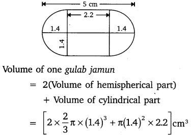 A gulab jamun, contains sugar syrup up to about 30% of its volume. Find approximately how much syrup would be found in 45 gulab jamuns, each shaped like a cylinder with two hemispherical ends with length 5 cm and diameter 2.8 cm (see figure).