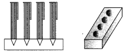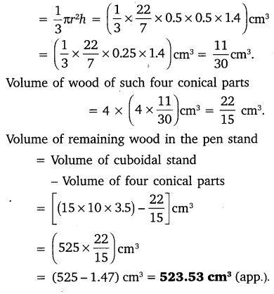 A pen stand made of wood is in the shape of a cuboid with four conical depressions to hold pens. The dimensions of the cuboid are 15 cm by 10 cm by 3.5 cm. The radius of each of the depressions is 0.5 cm and the depth is 1.4 cm. Find the volume of wood in the entire stand (see figure).
