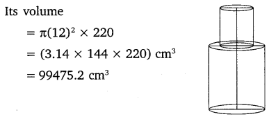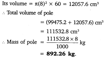 A solid iron pole consists of a cylinder of height 220 cm and base diameter 24 cm, which is surmounted by another cylinder of height 60 cm and radius 8 cm. Find the mass of the pole, given that 1 cm3 of iron has approximately 8 g mass. (Use π = 3.14)