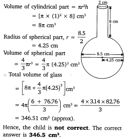 A spherical glass vessel has a cylindrical neck 8 cm long, 2 cm in diameter, the diameter of the spherical part is 8.5 cm. By measuring the amount of water it holds, a child finds its volume to be 345 cm3. Check whether she is correct, taking the above as the inside measurements, and π = 3.14.