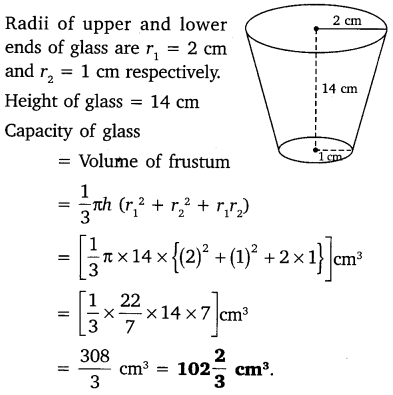 A drinking glass is in the shape of a frustum of a cone of height 14 cm. The diameters of its two circular ends are 4 cm and 2 cm. Find the capacity of the glass.