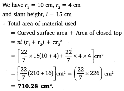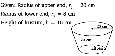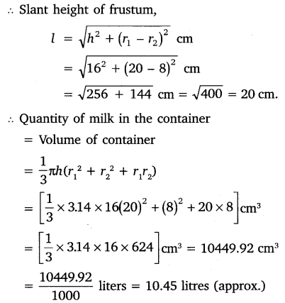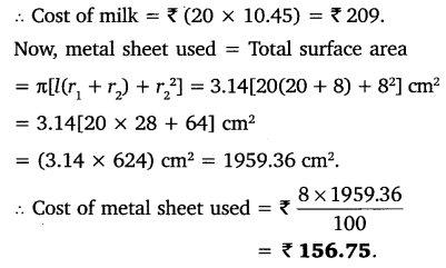 A container, opened from the top and made up of a metal sheet, is in the form of a frustum of a cone of height 16 cm with radii of its lower and upper ends as 8 cm and 20 cm, respectively. Find the cost of the milk which can completely fill the container, at the rate of ₹ 20 per litre. Also find the cost of metal sheet used to make the container, if it costs ₹ 8 per 100 cm2. (Take π = 3.14)