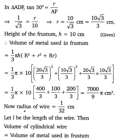 A metallic right circular cone 20 cm high and whose vertical angle is 60° is cut into two parts at the middle of its height by a plane parallel to its base. If the frustum so obtained be drawn into a wire of diameter cm, find the length of the wire.