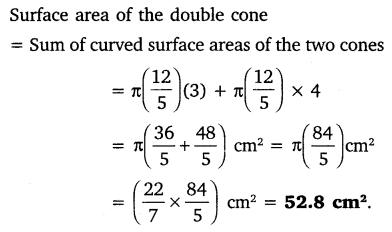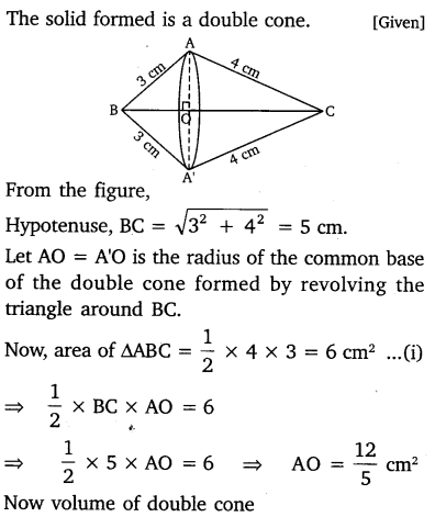 A right triangle, whose sides are 3 em and 4 cm (other than hypotenuse) is made to revolve about its hypotenuse. Find the volume and surface area of the double cone so formed. (Choose value of as found appropriate)