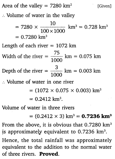 In one fortnight of a given month, there was a rainfall of 10 cm in a river valley. If the area of the valley is 7280 km, show that the total rainfall was approximately equivalent to addition to the normal water of three rivers each 1072 km long. 75 m wide and 3 m deep.