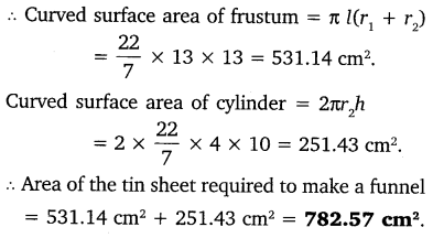 An oil funnel made of tin sheer consists of a 10 cm long cylindrical portion attached to a frustum of a cone. If the total height is 22 cm, diameter of the cylindrical portion is 8 cm and the diameter of the top of the funnel is 18 cm, find the area of the tin sheet required to make the funnel.