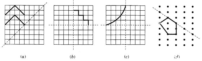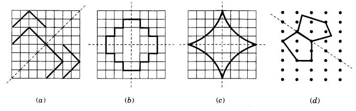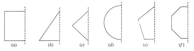 In the following figures, the mirror line (i.e., the line of symmetry) is given as a dotted line. Complete each figure performing reflection in the dotted (mirror) line. (You might perhaps place a mirror along the dotted line and look into the mirror for the image). Are you able to recall the name of the figure you complete?