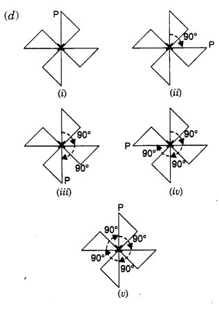 (e) In a full turn, there are four positions (on rotation through the angles 90°, 180°, 270°, and 360°) when the figure looks exactly the same.