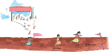 (c) Since Rehana is 6 metres ahead of Konkana and Uma, Arundhati is 3 metres ahead of Rehana and Arundhati is 6 metres behind the finishing line. ∴ Distance of the finishing line from Konkana and Uma = 6 m + 3 m + 6 m = 15 m Thus, Konkana and Uma are 15 metres far away from the finishing line.