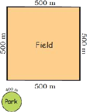 • Devi Prasad took 1 round of the square field whose each side was 500 m long. Distance covered to take 1 round of the field = (500 + 500 + 500 + 500) m = 2000 m We know 1000 m = 1 km Thus, 2000 m = 2 km So, Devi Prasad ran 2 km to take one round of the field as advised by the doctor. Length of the boundary of the park = 400 m Number of rounds of the park taken by Devi Prasad to run 400 m = 1