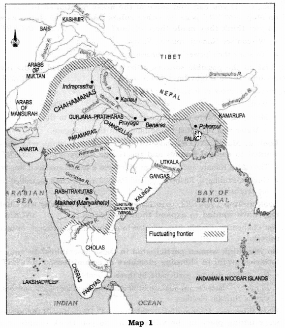 Locate the Gurjara-Pratiharas, Rashtrakutas, Palas, Cholas and Chahamanas (Chauhans). Can you identify the present-day states over which they exercised control? (NCERT Page 16)