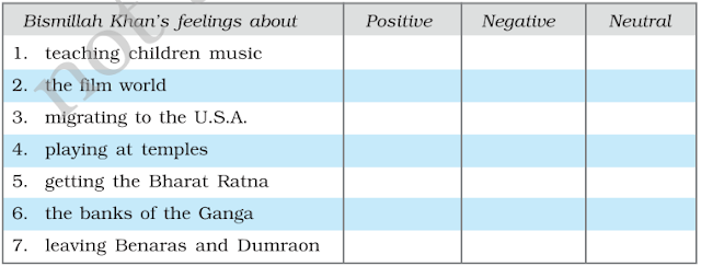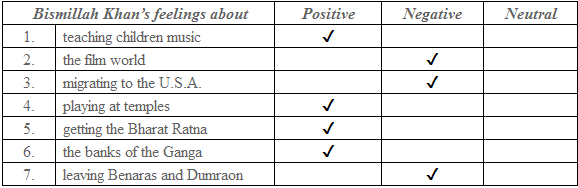 Answer 1. The pungi was a ‘reeded noisemaker.’ 2. A barber transformed the pungi into a shehnai. 3. Bismillah Khan’s paternal ancestors were professional musicians. 4. Bismillah Khan learnt to play the shehnai from Ali Bux. 5. Bismillah Khan’s first trip abroad was to Afghanistan. II. Find the words in the text which show Ustad Bismillah Khan’s feelings about the items listed below. Then mark a tick (✔ ✔) in the correct column. Discuss your answers in class.