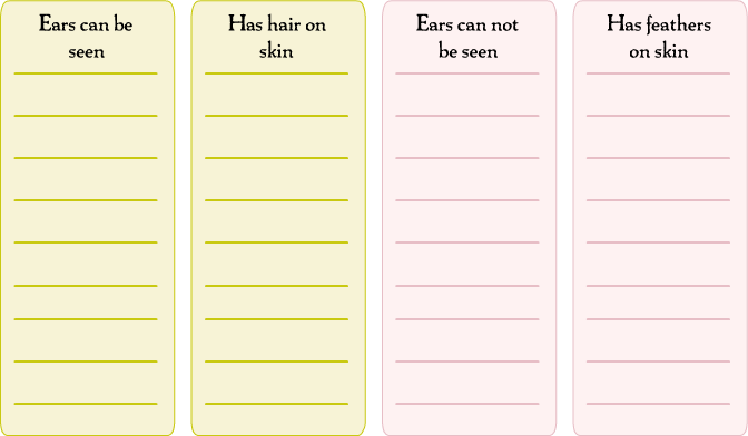 Different animals have different kinds of ears. Among the animals given below, which one have ears that you can see? In which animal can you not see the ears? Write in the table below.