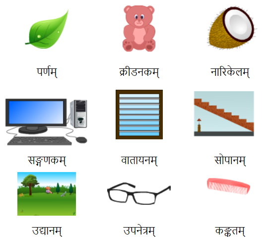 | द्वारम् | विमानम् | कमलम् | पुस्तकम् |
