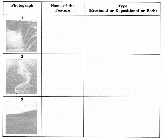 | Photograph | Nature of the Feature | Type (Erosional or depositional or Both |