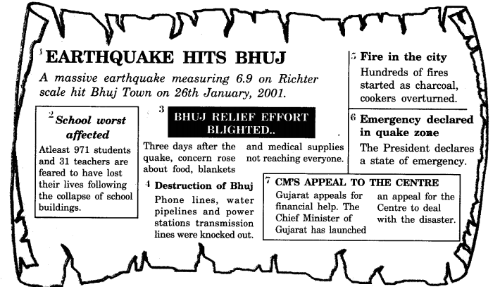 1. Read the ‘Earthquake – A case study’ given in the form of headlines that appeared in the newspapers after the quake. Arrange the events in the right sequence of their happening.