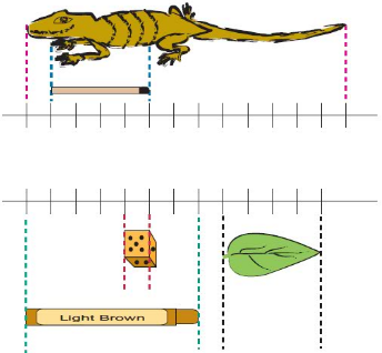 The matchstick is 4 centimetres long. The die is 1 centimetre from every side. The lizard is 13 centimetres long. The leaf is ______ centimetres long. The wax colour is ______ centimetres long.