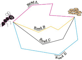 Gibli and the Grains Ant Gibli has to reach the grains. She is looking for the shortest road. Can you tell her which is the shortest?