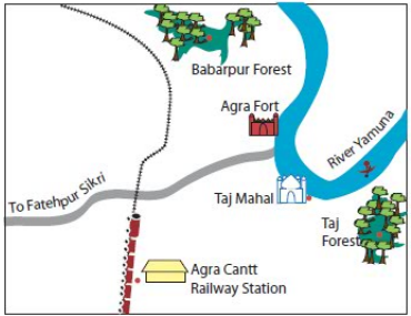 Now look at the distances between these places (for kilometres we write km). • Agra Cantt. Railway Station to Taj Mahal – 5 km • Taj Mahal to Agra Fort – 2 km • Agra Fort to Fatehpur Sikri – 40 km Now find from the map • Which is farther from Agra Cantt. Railway Station — Taj Mahal or Fatehpur Sikri?