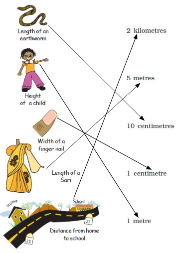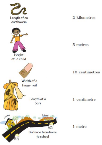 Things that are measured in metres: 1. Length of a Pagdi worn by Sikhs 2. Waist of an elephant 3. Depth of a well 4. Distance from school to home
