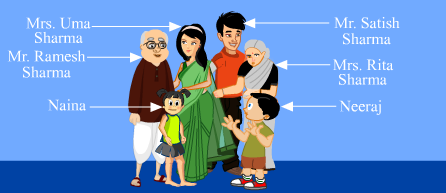 Name Relationship Name RelationNeeraj Myself Rita SharmaMy grandmotherNainaMy sister Uma Sharma My motherRamesh SharmaMy grandfather Satish SharmaMy father