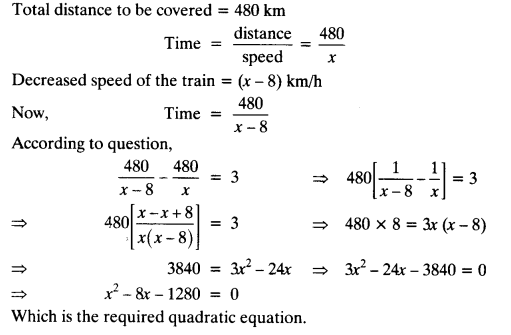 (iv) A train travels a distance of 480 km at a uniform speed. If the speed had been 8 km/h less, then it would have taken 3 hours more to cover the same distance. We need to find the speed of the train.