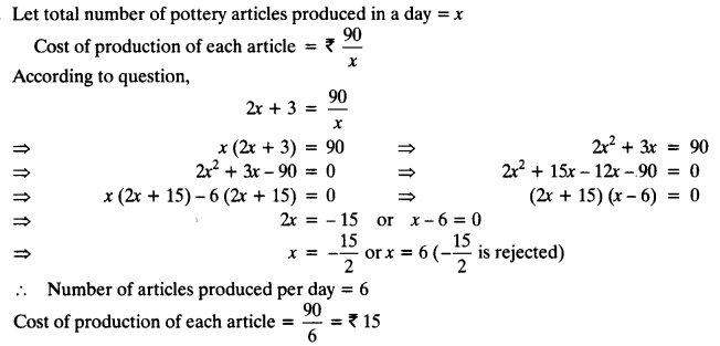 A cottage industry produces a certain number of pottery articles in a day. It was observed on a particular day that the cost of production of each article (in rupees) was 3 more than twice the number of articles produced on that day. If the total cost of production on that day was ₹90, find the number of articles produced and the cost of each article.